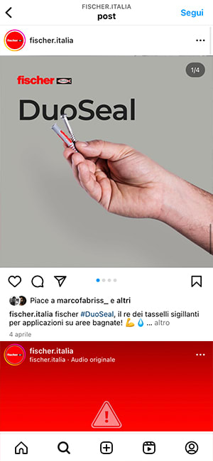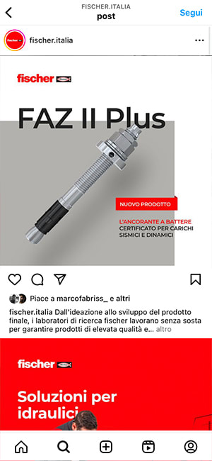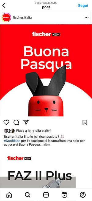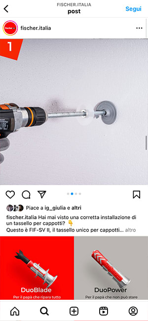 fischer is the benchmark for planners, contractors and installers in the building industry and the top of mind brand for dowels. For our subsidiary fischer Italia we developed a social media strategy capable of speaking to the company’s diverse target audience (retailers, private DIY enthusiasts, professionals and craftsmen, engineers and architects) on the most appropriate platform. And the content? We revised them with a fresher and lighter style, creating ad hoc shootings and minivideos for Ig Reels and TikTok.